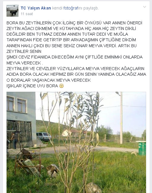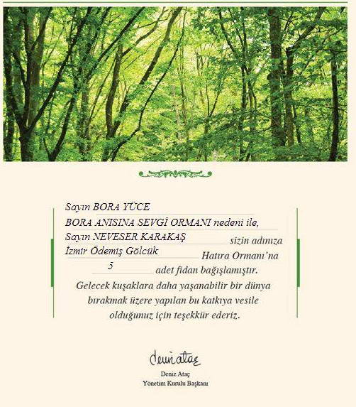 Neriman Yüce bana gönderdiği mesajda şunları yazıyordu; “Burs ile birlikte Bora’nın arkadaşları ağaç dikmeye başladılar. Daha önce ABD’de yaşayan Bora’nın bir çok ülkede Türk ve yabancı arkadaşı olduğunu öğrendim. Başlattıkları ağaç dikmeye ‘BORA SEVGİ ORMANI’ adını verdiler.”