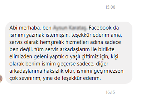 Ertesi gün bir tanıdığım aradı; “Evde fasulye pişirip hastasına getiren o hemşire eşim” dedi. Ayrıca eşinin İstanbul’da görev yaptığı zaman “YILIN HEMŞİRESİ” seçildiğini de anlattı. İsmini yazabilir miyim diye sordum. Tabi yazabilirsin dedi.