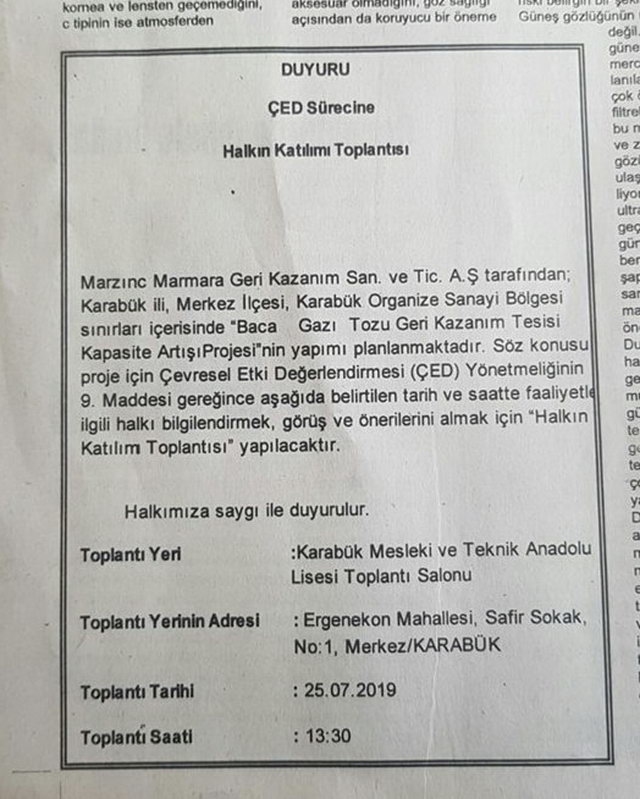 Marzinc Marmara Geri Kazanım San. Tic. A.Ş tarafından; Karabük ili, Merkez ilçesi, Karabük Organize Sanayi Bölgesi sınırları içerisinde “Baca Gazı Tozu Geri Kazanım Tesisi Kapasite Artışı Projesi”nin yapımı planlanmaktadır. Söz konusu proje için Çevresel Etki Değerlendirmesi (ÇED) Yönetmeliğinin 9. Maddesi gereğince aşağıda belirtilen tarih ve saatte faaliyetle ilgili halkı bilgilendirmek, görüş ve önerilerini almak için “Halkın Katılım Toplantısı” yapılacaktır.