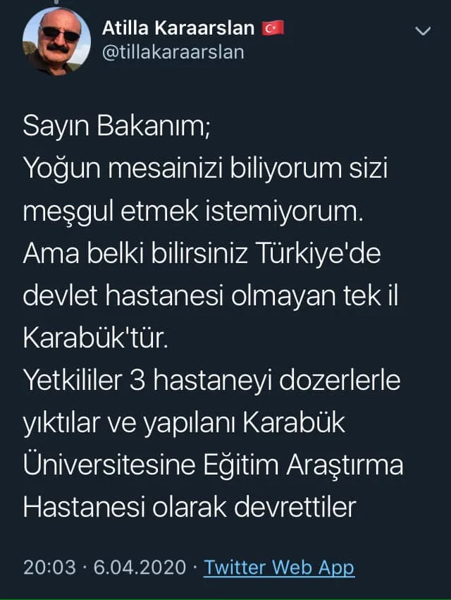 Karabük’te sağlık sistemi çok ciddi sıkıntı yaşıyor. Dediğim gibi artık size güveniyoruz. Bilgilerinize arz ederim