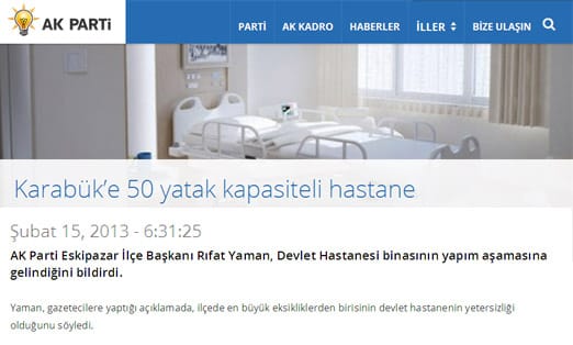 AK Parti Eskipazar İlçe Başkanı Rıfat Yaman’ın 2013 yılında gazetecilere yaptığı açıklamada 50 yataklı olacağı belirtilen Eskipazar Devlet Hastanesi kapasitesi Sağlık Bakanlığı tarafından 25 yataklı olarak belirlendi.