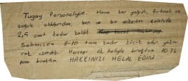 Burada ısınmak için sobada odun yakan askerler ısındıktan sonra yayla evinden ayrılıyorlar. Evden ayrılırken eve 10 TL para ve bir karton parçasına şu yazılı notu bırakıyorlar. “Ben Bolu Tugay Personeliyim. Hava kar yağışlı, fırtınalı ve soğuk olduğundan ben ve bir askerim evinizde 2.5 saat konakladık. Sobanızda 8-10 tane küçük odun yakarak ısındık. Her şeyi ilk haliyle bıraktım. 10 TL’de para bıraktım. Hakkınızı helal edin.”